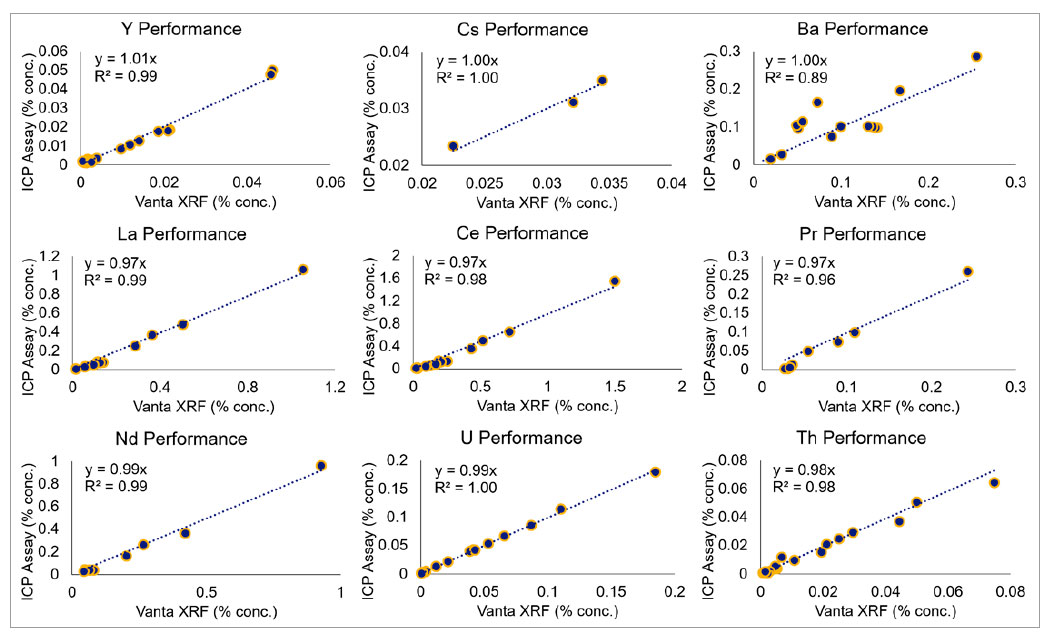 Vanta手持式XRF光譜儀在檢測(cè)各種礦石樣品(包括氟碳酸鹽和次生磷酸鹽)時(shí),表現(xiàn)出非常高的性能。氟碳酸鹽通常是氟碳鈰礦石,可提供釔、鈰和鑭;而磷酸鹽通常是獨(dú)居石,不僅含有鑭、鈰、鐠和釹,還含有較重的稀土元素釤和釓,以及放射性較弱的釷。正如每個(gè)圖表所示,元素的斜率和R2都接近于1,說明Vanta在檢測(cè)氟碳鈰礦石和獨(dú)居石時(shí)均表現(xiàn)出很高的準(zhǔn)確性。