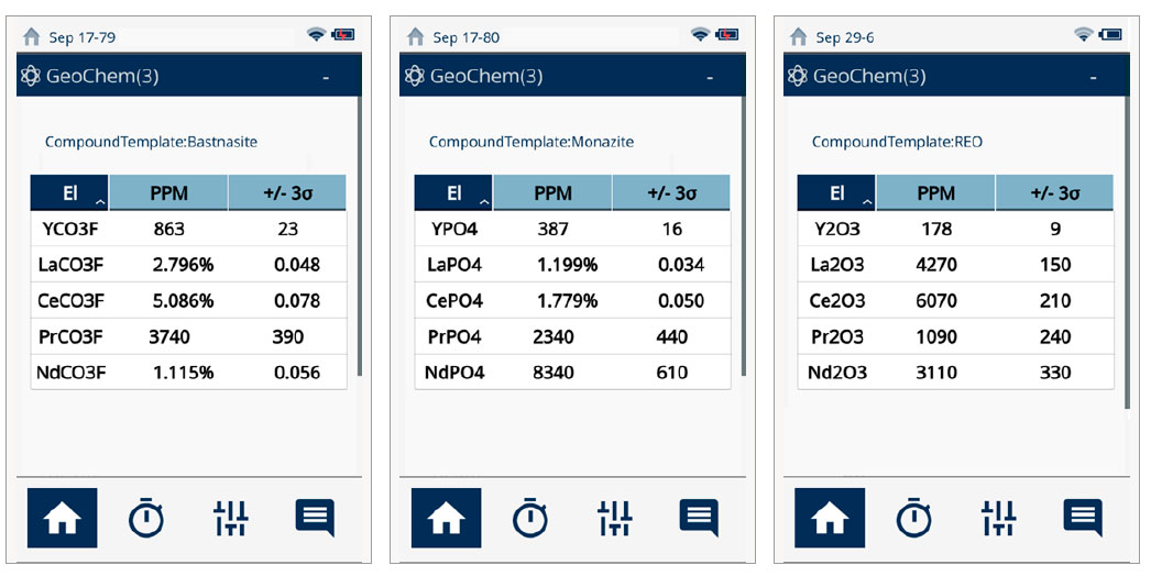 雖然稀土元素在技術(shù)上并不“稀有”,但它們通常不會(huì)像金(Au)或其他礦物那樣以高含量的礦脈形式存在。因此對(duì)稀土礦石的識(shí)別和開采非常困難。此外,稀土礦石的加工是一項(xiàng)較為獨(dú)特、主要是化學(xué)工程的任務(wù),遠(yuǎn)比加工金和賤金屬礦石復(fù)雜。Vanta手持式XRF光譜儀可以檢測(cè)低至兩位數(shù)ppm水平的稀土金屬,是在現(xiàn)場(chǎng)快速識(shí)別這些寶貴元素的理想工具。此外,Vanta光譜儀可以在野外計(jì)算稀土氧化物的含量,如下圖所示。圖2.