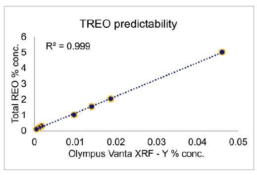 圖3. Vanta手持式XRF光譜儀基于所測(cè)到釔的含量可以準(zhǔn)確預(yù)測(cè)總稀土氧化物的含量。