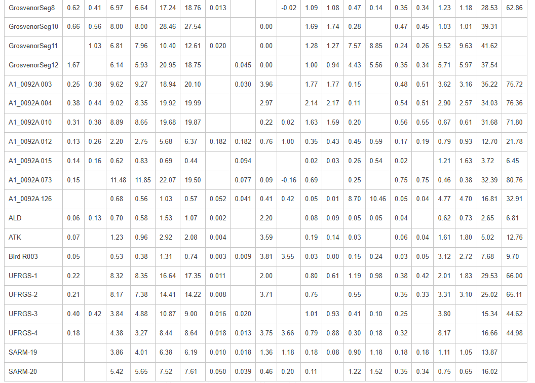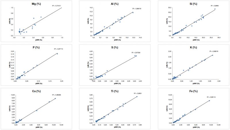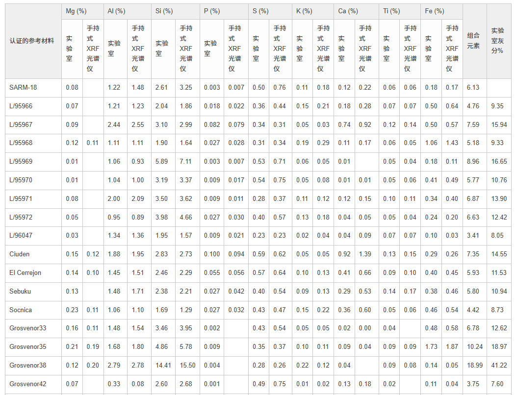 圖2. 奧林巴斯手持式XRF光譜儀檢測大量煤認證參考材料(CRM)獲得的結(jié)果與這些材料的標(biāo)稱值高度吻合。上面的圖表表明對于重要元素:Mg、Al、Si、P、S、K、Ca、Ti和Fe,實驗室認證值和XRF分析儀獲得的數(shù)據(jù)值在準確性和精確性方面都表現(xiàn)出高度的一致性。 數(shù)據(jù)表包含了繪制這些圖表所依據(jù)的實驗室數(shù)據(jù)和XRF數(shù)據(jù)。數(shù)據(jù)承蒙新南威爾士大學(xué)生物和地球科學(xué)學(xué)院提供 - ACARP項目。