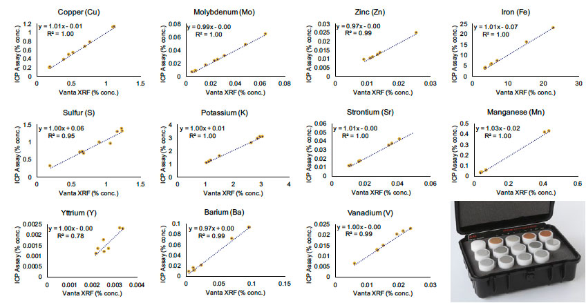CODES團隊展示了他們對使用傳統(tǒng)ICP-MS/ICP-ES(電感耦合等離子體質譜法和發(fā)射光譜法)和手持式XRF分析儀檢測來自六個礦區(qū)的樣品所獲得結果進行比較的情況:(1)美國Yerington斑巖銅礦區(qū)(±鉬-金);(2)美國Resolution斑巖銅-鉬礦床;(3)秘魯Las Bambas銅-鐵矽卡巖礦區(qū);(4)澳大利亞Cadia銅-金礦區(qū);(5)澳大利亞Northparkes銅-金礦區(qū);(6)澳大利亞Cowal銅-金礦區(qū)。