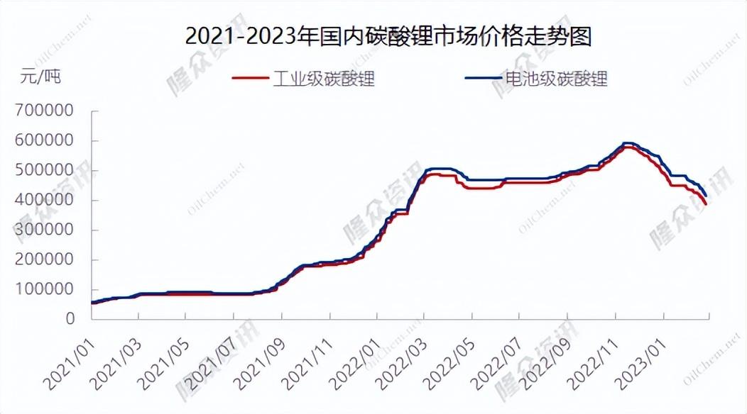 據(jù)上海鋼聯(lián)數(shù)據(jù)顯示,2月23日,電池級碳酸鋰跌7500元/噸,均價報41.5萬元/噸;工業(yè)級碳酸鋰跌10000元/噸,均價報38.5萬元/噸。其中,電池級碳酸鋰當前報價相比2022年11月每噸60萬元的高點,跌幅超過30%。