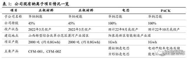 100%持股的華鈉芯能為鈉離子電池電芯廠的運(yùn)營(yíng)主體,1Gwh 電芯項(xiàng)目于 2022 年 7 月在陽(yáng)泉市高新區(qū)進(jìn)行開(kāi)工儀式,據(jù)公司公告:山西華陽(yáng)集團(tuán)新能股份有限公司(以下簡(jiǎn)稱“公司”)的全資孫公司山西華鈉芯能科技有限責(zé)任公司投資建設(shè)的鈉離子電芯生產(chǎn)線設(shè)備安裝調(diào)試已完成,公司于 2022 年 9 月 30 日在陽(yáng)泉市高新區(qū)高端制造產(chǎn)業(yè)園區(qū)舉辦鈉離子電芯生產(chǎn)線出品儀式。公司鈉離子電芯的出品,為鈉離子電池產(chǎn)業(yè)高質(zhì)量發(fā)展奠定了扎實(shí)基礎(chǔ)。