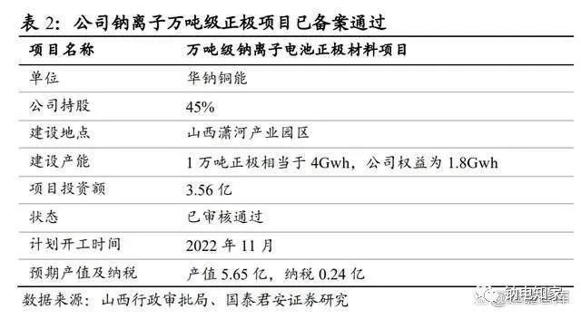 據(jù)山西轉(zhuǎn)型綜改示范區(qū)行政審批局2022年度 7 月企業(yè)投資項(xiàng)目備案結(jié)果公示表,公司萬(wàn)噸級(jí)鈉離子電池正極材料項(xiàng)目已審核通過(guò),且 11 月開(kāi)工。