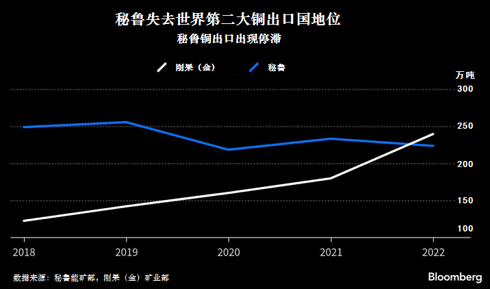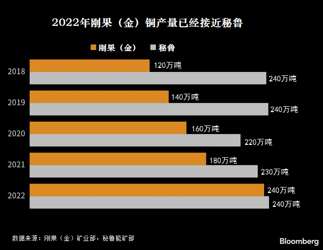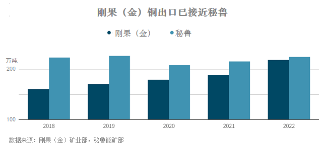 最近的一份報(bào)告認(rèn)為,未來(lái)幾年,由于秘魯產(chǎn)量停滯,剛果(金)將占據(jù)全球第二大產(chǎn)銅國(guó)的位置。鄰國(guó)智利仍然是世界最大銅生產(chǎn)國(guó)和供應(yīng)國(guó)。彭博通訊社報(bào)道,2022年剛果(金)銅出口量為240萬(wàn)噸,而秘魯銅出口量為220萬(wàn)噸。