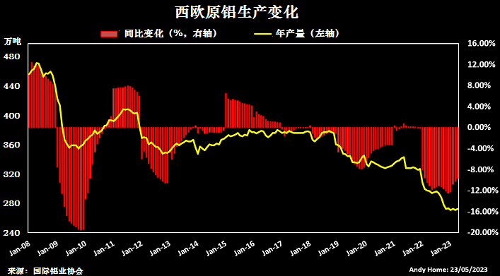 過去15年中,西歐原鋁產量持續(xù)下降,從過去的450萬噸降至目前的270萬噸。