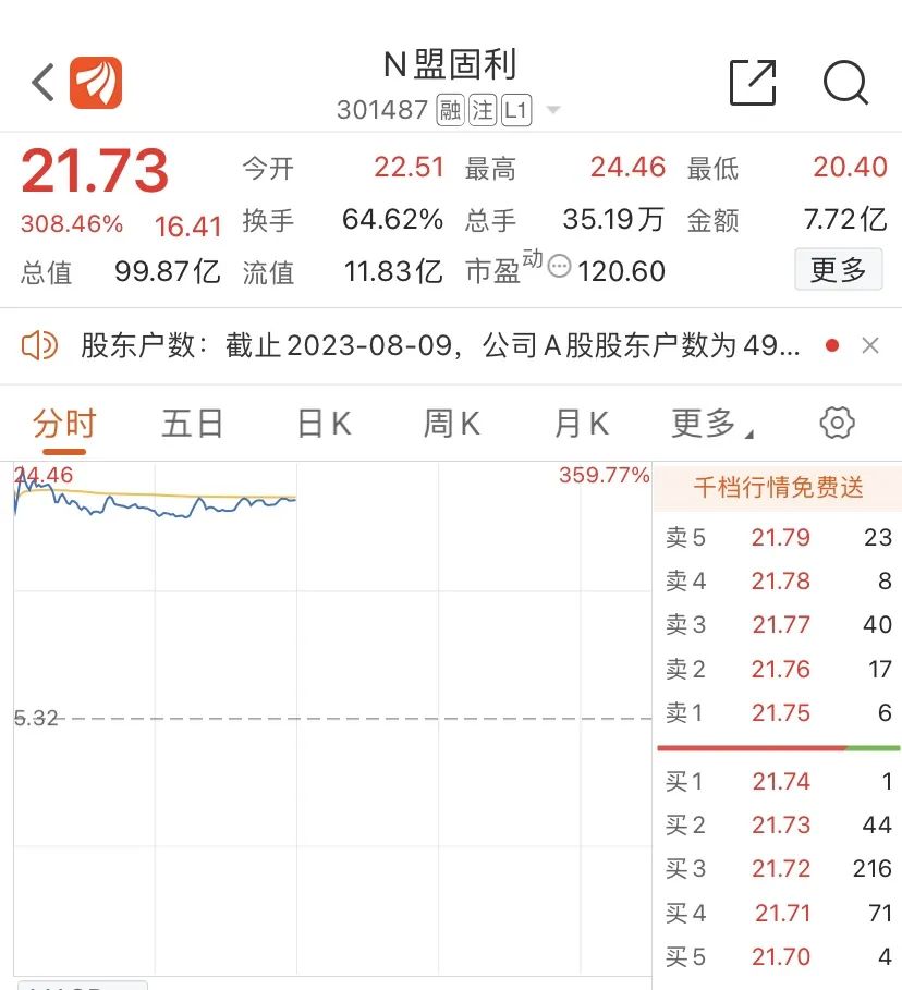 截至上午收盤,盟固利股價(jià)報(bào)21.73元/股,漲幅308.46%,總市值約100億元。