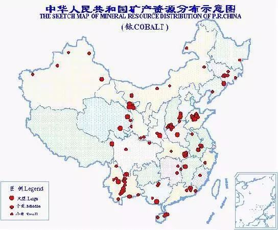 中國鈷礦資源不多,獨(dú)立鈷礦床尤少,主要作為伴生礦產(chǎn)與鐵、鎳、銅等其他礦產(chǎn)一道產(chǎn)出。已知鈷礦產(chǎn)地150處,分布于24個(gè)省(區(qū)),以甘肅省儲(chǔ)量最多,約占全國總儲(chǔ)量的30%。全國總保有儲(chǔ)量鈷47萬噸。
