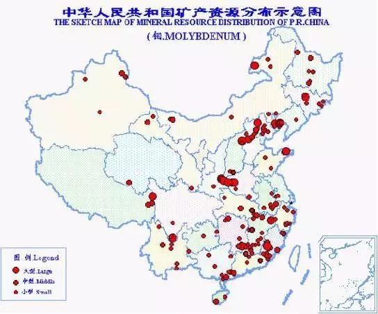 中國鉬礦資源豐富,總保有儲(chǔ)量鉬840萬噸,居世界第2位。探明儲(chǔ)量的礦區(qū)有222處,分布于28個(gè)?。▍^(qū)、市)。以河南省鉬礦資源為最豐富,鉬儲(chǔ)量占全國總儲(chǔ)量的30.1%。
