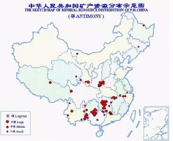 中國是世界上銻礦資源最為豐富的國家??偙S袃?chǔ)量銻278萬噸,居世界第1位。已探明儲(chǔ)量的礦區(qū)有111處,分布于全國18個(gè)?。▍^(qū)),以廣西銻儲(chǔ)量為最多,約占全國的41.3%;其次為湖南、云南、貴州、甘肅、廣東等省。