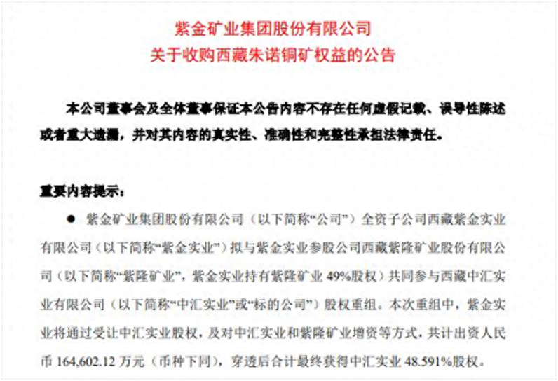 8月21日,紫金礦業(yè)宣布,以16.46億元收購中匯實業(yè)48.591%股權(quán),進(jìn)而獲得國內(nèi)未開發(fā)超大型銅礦西藏朱諾銅礦的相對控股權(quán)。根據(jù)協(xié)議,未來,朱諾銅礦的建設(shè)及運營將由紫金礦業(yè)主導(dǎo)。