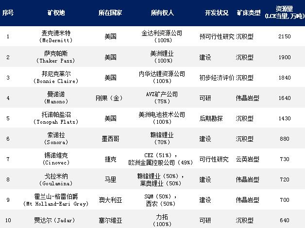 根據(jù)總資源量(LCE,碳酸鋰當(dāng)量,萬(wàn)噸,以下同),Mining Intelligence網(wǎng)站列出了世界前十大粘土和硬巖鋰礦。