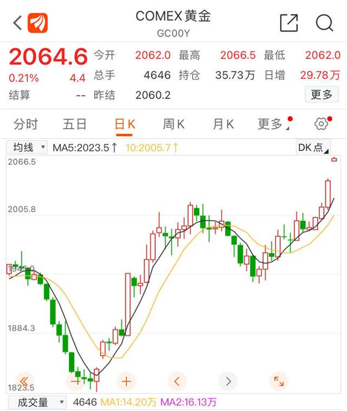 繼上周五國際金價突破2000美元關(guān)口后,11月29日紐約商品交易所COMEX12月黃金期貨持續(xù)收漲,截止29日八點(diǎn),該指數(shù)暫報2064.7美元,連漲四日且創(chuàng)5月中旬以來的半年新高,也越來越逼近2080美元的歷史最高。