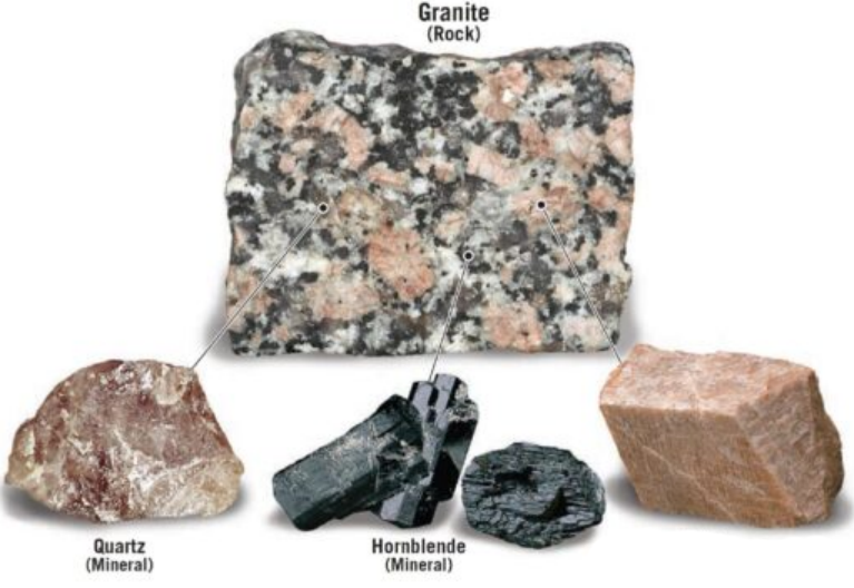 巖石的構(gòu)成:如前所述,巖石由礦物或礦物質(zhì)組成。巖石的組成取決于其中存在的礦物。有些巖石可能由單一礦物組成,而其他巖石可能含有多種礦物。例如,花崗巖主要由石英、長石和云母組成,而玄武巖主要由斜長石和輝石組成。礦物的構(gòu)成:礦物是具有特定化學(xué)配方的元素化合物。它們是巖石的基本組成部分,并且可以根據(jù)它們獨特的物理和化學(xué)特性來識別。一些常見的礦物包括石英、長石、云母、方解石和赤鐵礦,每種都有其獨特的特征。