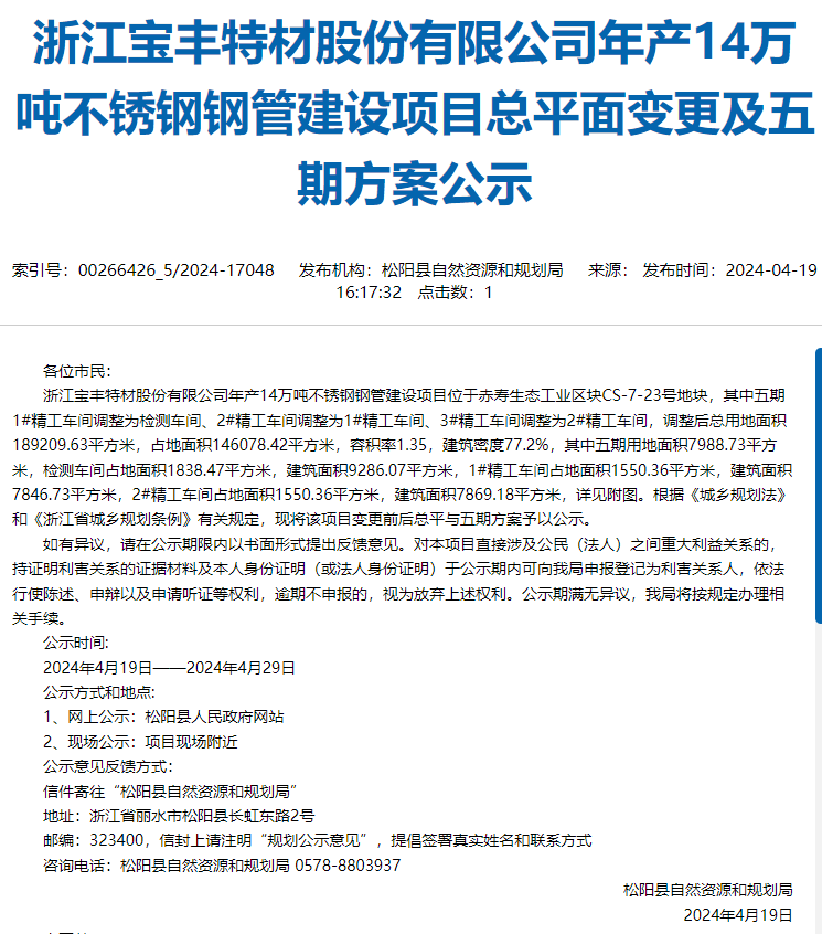 4月19日,麗水市松陽縣人民政府發(fā)布,松陽縣自然資源和規(guī)劃局就浙江寶豐特材股份有限公司年產14萬噸不銹鋼鋼管建設項目總平面變更及五期方案對外進行公示,公示時間:2024年4月19日-2024年4月29日。