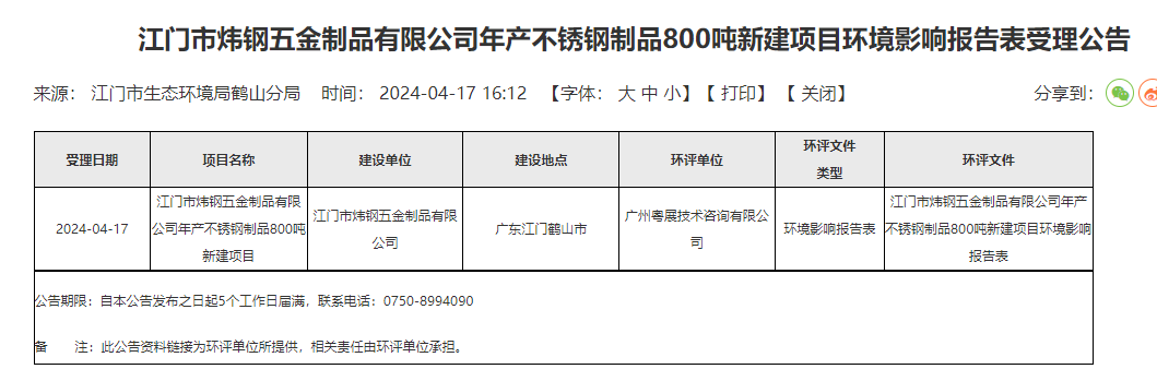 鶴山市人民政府消息,4月17日,江門市生態(tài)環(huán)境局鶴山分局受理江門市煒鋼五金制品有限公司年產不銹鋼制品800噸新建項目環(huán)境影響報告表并對外進行公告,公告期:5個工作日。