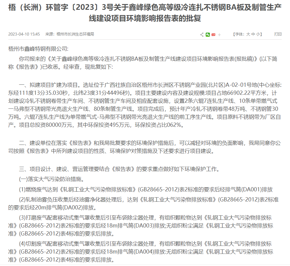 梧州市長洲生態(tài)環(huán)境局就鑫峰綠色高等級冷連扎不銹鋼BA板及制管生產線建設項目環(huán)境影響報告表作出批復意見。