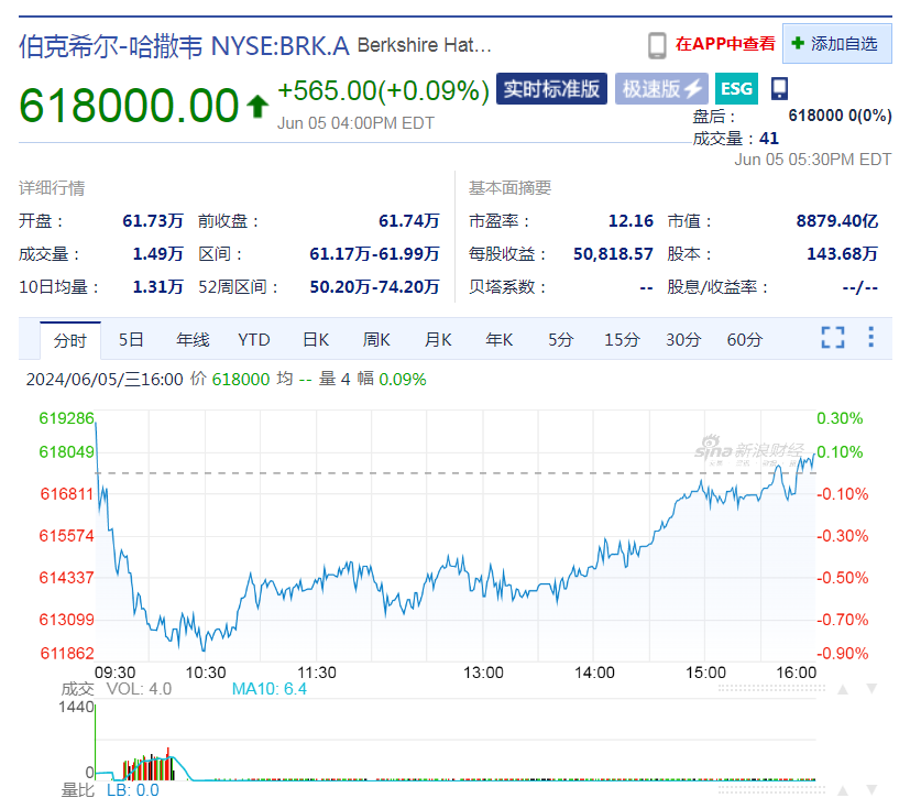 據(jù)悉,巴菲特從2019年首次投資西方石油,2022年一季度開始連續(xù)三個季度大幅增持。今年2月初,巴菲特曾連續(xù)三個交易日增持西方石油,累計購買430萬股。截至當?shù)貢r間6月5日收盤,伯克希爾-哈撒韋美股報618000美元,漲幅0.09%,市值8879.40億美元。