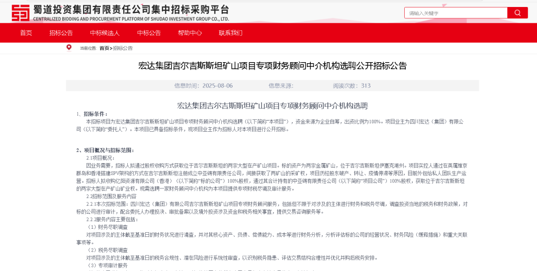 消息源于蜀道投資集團(tuán)集中招標(biāo)采購(gòu)平臺(tái)發(fā)布的《宏達(dá)集團(tuán)吉爾吉斯斯坦礦山項(xiàng)目專項(xiàng)財(cái)務(wù)顧問(wèn)中介機(jī)構(gòu)選聘公開招標(biāo)公告》。公告顯示,宏達(dá)集團(tuán)計(jì)劃收購(gòu)億陽(yáng)資源有限公司 (香港) 100% 股權(quán),通過(guò)這一操作,將間接掌控中亞錫有限責(zé)任公司100% 股權(quán),進(jìn)而獲取位于吉爾吉斯斯坦伊塞克湖州的兩宗大型在產(chǎn)礦山礦業(yè)權(quán)。為順利推進(jìn)收購(gòu),宏達(dá)集團(tuán)正在公開選聘一家財(cái)務(wù)顧問(wèn)中介機(jī)構(gòu),為項(xiàng)目提供專項(xiàng)財(cái)稅盡調(diào)及審計(jì)服務(wù),項(xiàng)目資金全部來(lái)源于企業(yè)自籌。