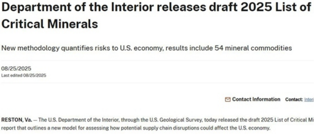 當(dāng)?shù)貢r間8月25日,美國地質(zhì)調(diào)查局發(fā)布《2025年關(guān)鍵礦產(chǎn)清單》草案,54種礦產(chǎn)被列入清單。根據(jù)美國《能源法案》,關(guān)鍵礦產(chǎn)是由美國地質(zhì)勘探局認定的對美國經(jīng)濟和國家安全至關(guān)重要的礦產(chǎn)或物質(zhì),且相關(guān)礦產(chǎn)是產(chǎn)品制造的基礎(chǔ),但供應(yīng)鏈脆弱。被確定為關(guān)鍵礦產(chǎn)后,相關(guān)礦產(chǎn)的勘探開采和處理將享受資金激勵和更廣泛的支持性政策。