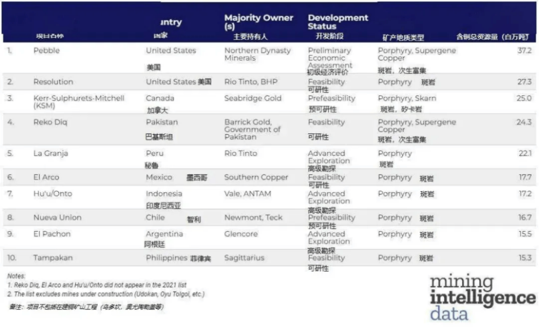 外媒Mining Intelligence根據(jù)三級(探明、推定和推測)資源量更新了世界十大未開發(fā)銅礦項目。前兩的未開發(fā)銅礦均位于美國。
