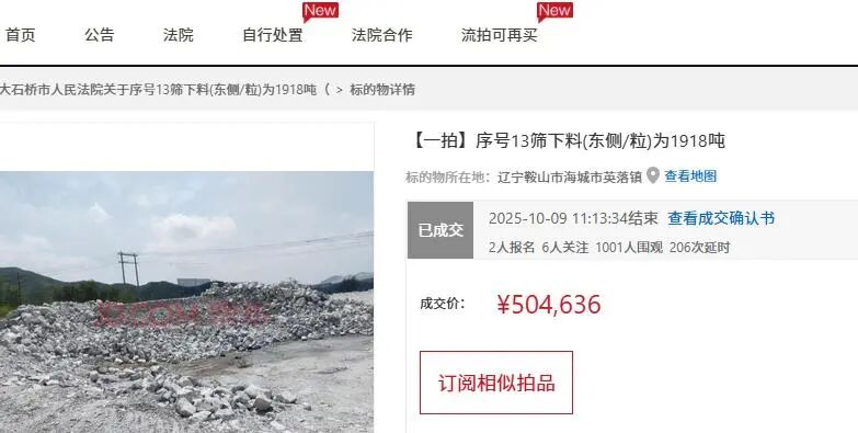 值得注意的是,也是在10月9日,同樣是存放在遼南鎂礦耐火材料廠青山懷鎂礦廠區(qū)內(nèi)的另外一批礦石也是被拍賣,礦石重量為1918噸,不過從圖片來看,礦石質(zhì)量要差一些。