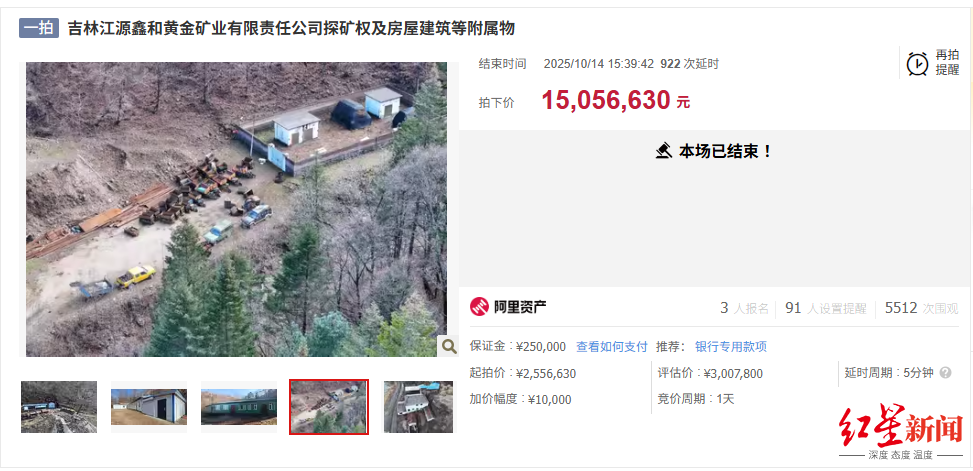 紅星資本局近日消息,吉林江源鑫和黃金礦業(yè)有限責(zé)任公司探礦權(quán)及房屋建筑等附屬物在阿里資產(chǎn)拍賣平臺被拍賣,本次拍賣經(jīng)過931輪出價(jià)(包括922次延時出價(jià)),最終以1505.663萬元的價(jià)格成交,對比起拍價(jià)255.663萬元,溢價(jià)1250萬元,溢價(jià)率達(dá)489%。