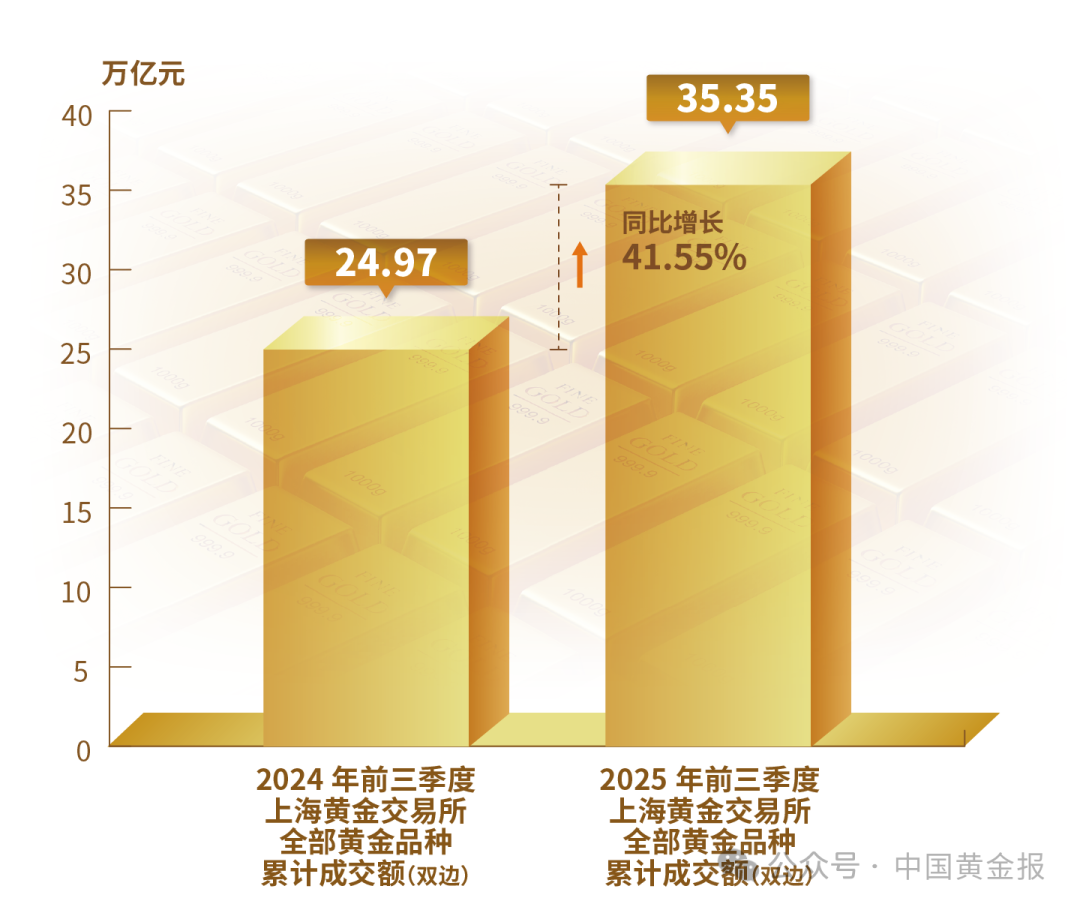 不同品類黃金產(chǎn)品的表現(xiàn)差異明顯。輕克重、附加值高的首飾產(chǎn)品仍保持較強(qiáng)市場(chǎng)吸引力,銷售情況較好。金條需求仍然旺盛,地緣沖突加劇與經(jīng)濟(jì)不確定性使得黃金避險(xiǎn)保值的功能進(jìn)一步凸顯。電子、新能源等產(chǎn)業(yè)的快速發(fā)展使得工業(yè)用金需求穩(wěn)步回升。 黃金市場(chǎng) 2025年前三季度,上海黃金交易所全部黃金品種累計(jì)成交量單邊2.38萬噸(雙邊4.76萬噸),同比上升2.45%;累計(jì)成交額單邊17.68萬億元(雙邊35.35萬億元),同比上升41.55%。上海期貨交易所全部黃金期貨期權(quán)累計(jì)成交量單邊10.36萬噸(雙邊20.72萬噸),同比上升59.98%;累計(jì)成交額單邊61.08萬億元(雙邊122.15萬億元),同比上升112.6%。
