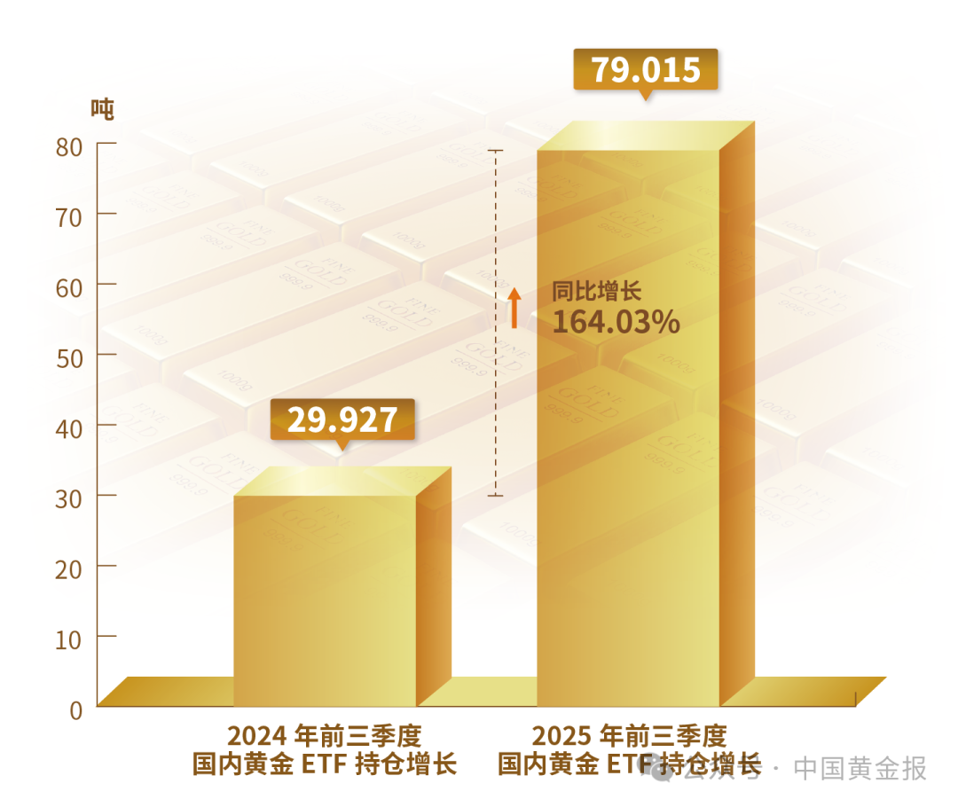 2025年前三季度,國(guó)內(nèi)黃金ETF增倉(cāng)量為79.015噸,較2024年前三季度增倉(cāng)量29.927噸,同比增長(zhǎng)164.03%。至9月底,國(guó)內(nèi)黃金ETF持倉(cāng)量為193.749噸。